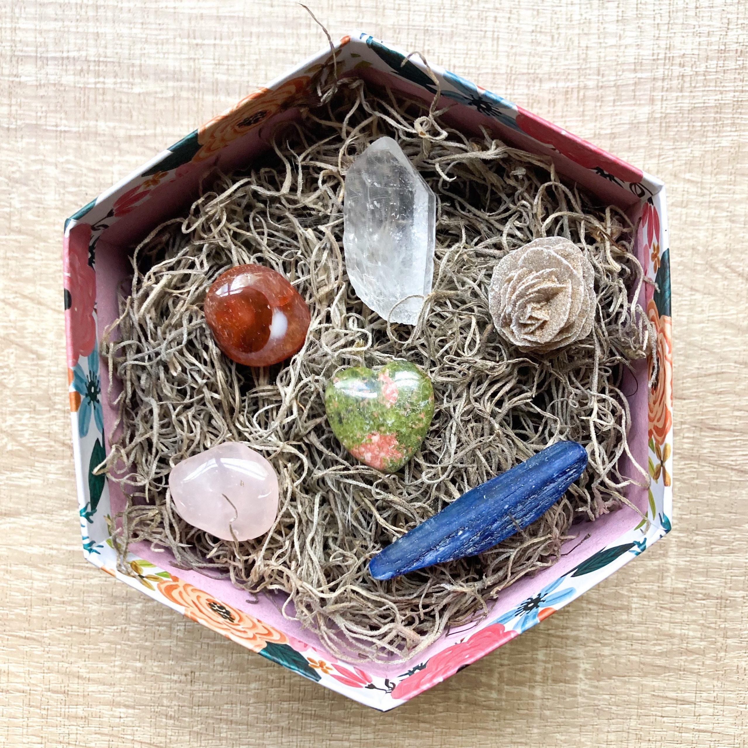 This crystal box contains the following stones: 1 Unakite Heart, Clear Quartz point, Desert Rose Selenite, Rose Quartz, Tumbled Kyanite and Carnelian.