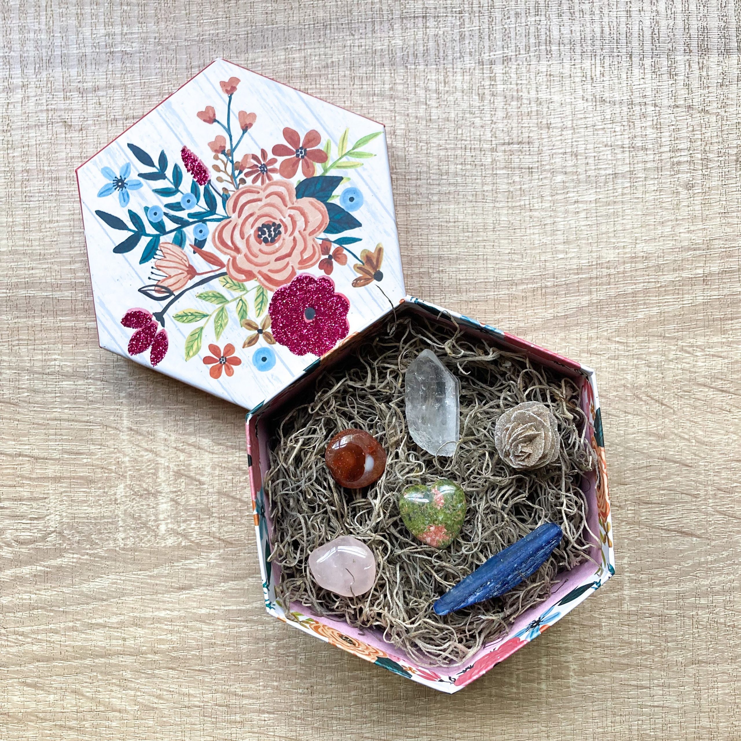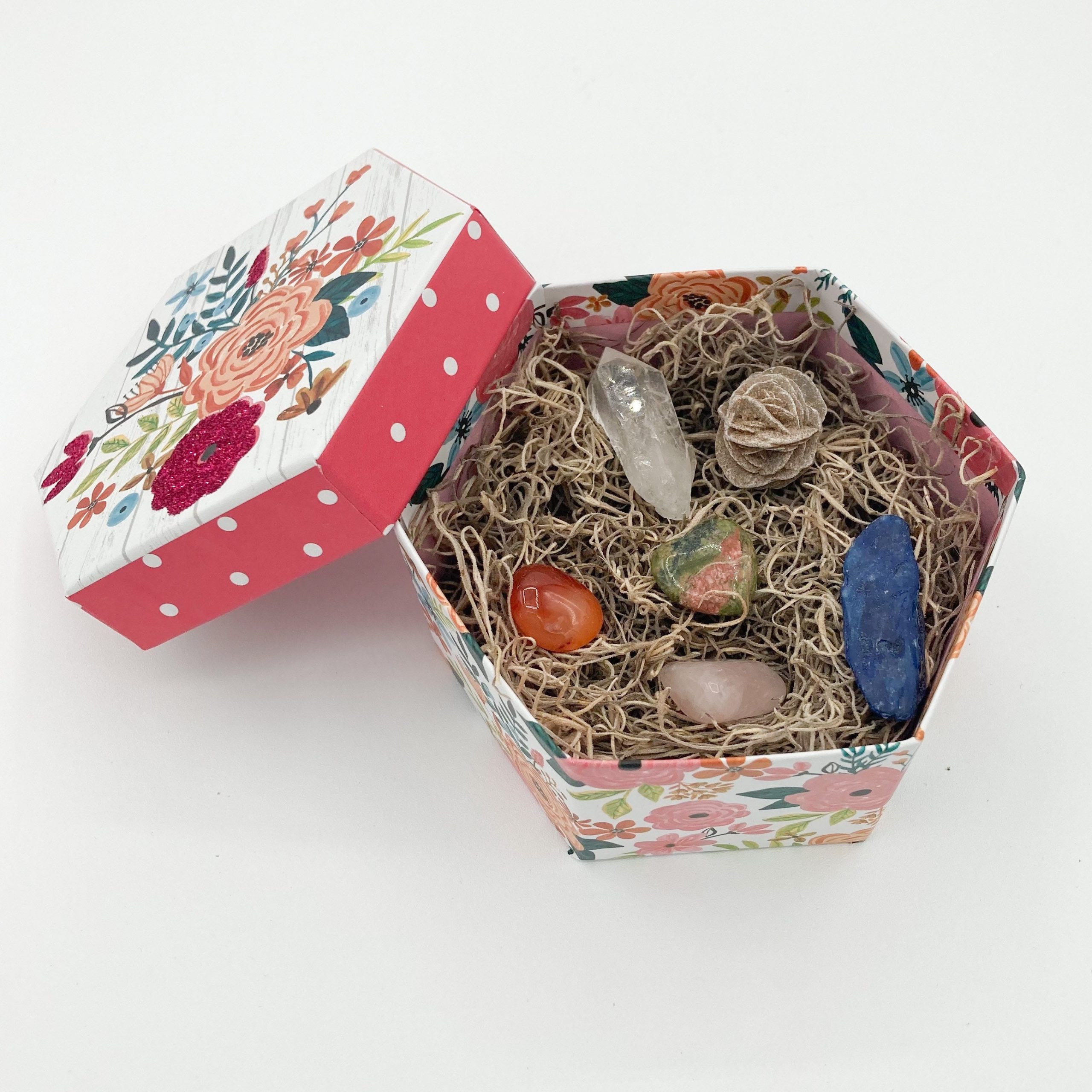 This Crystal Heart box for Mother's Day is a great addition to any stone collection. Featuring 6 stones in a sparkle floral decor box, this is a unique gift for your mother, girlfriend, wife, friend or any crystal enthusiast.