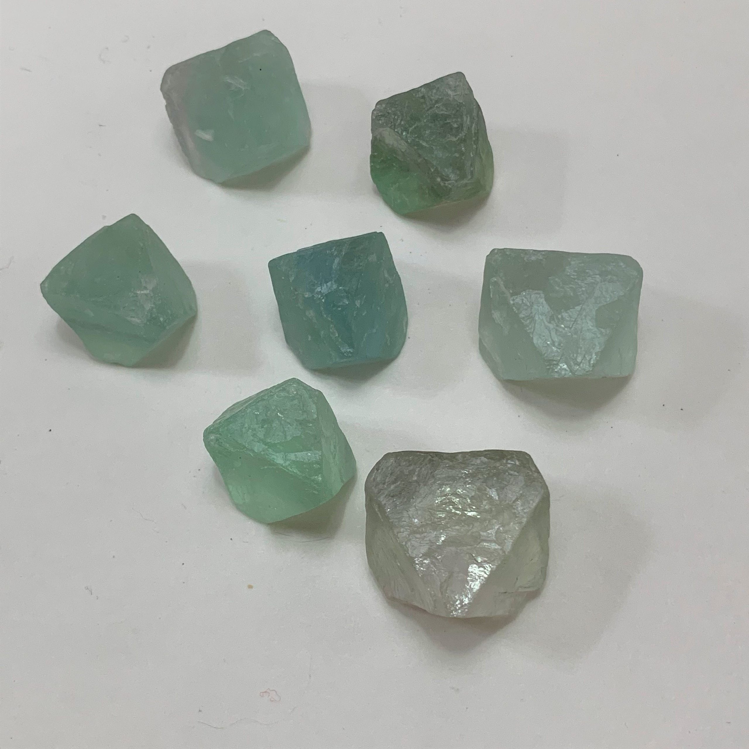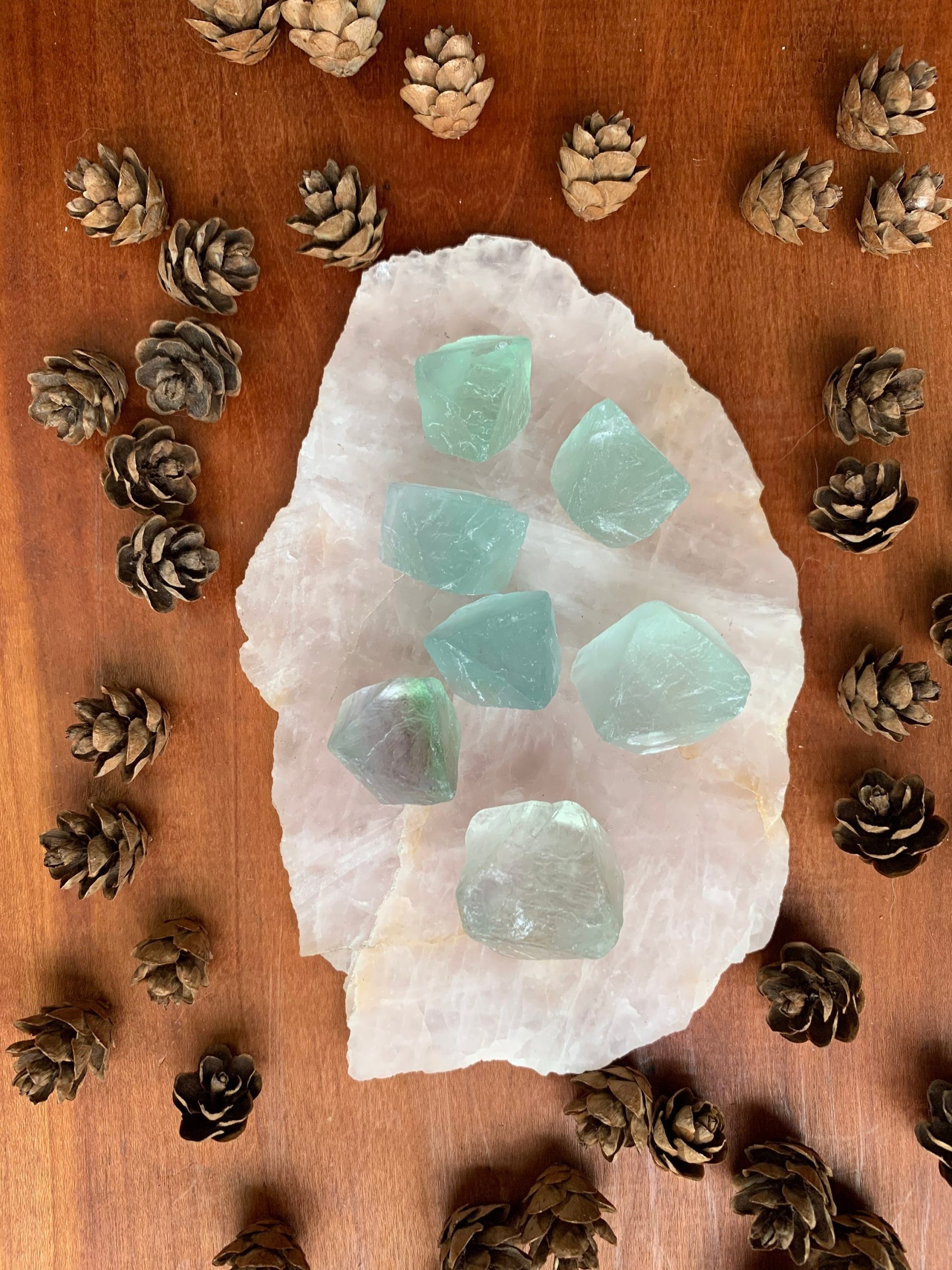 Fluorite Octahedrons are a beautiful example of sacred geometry. Fluorite's molecules naturally occur in octahedral form. These raw stones are cut along the cleave lines when mined showing off their natural raw shape. Fluorite is known for removing mental blocks, focusing and bringing mental clarity to difficult situations. Calmness and serenity have also been achieved when working with this crystal.