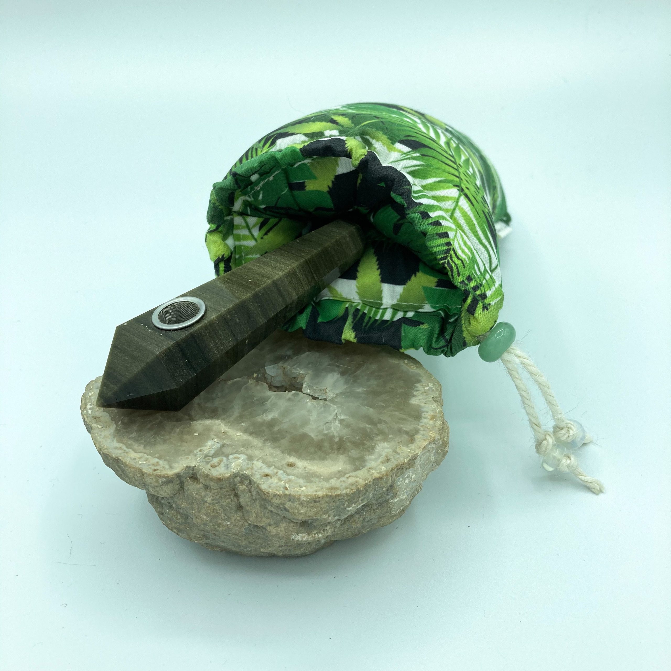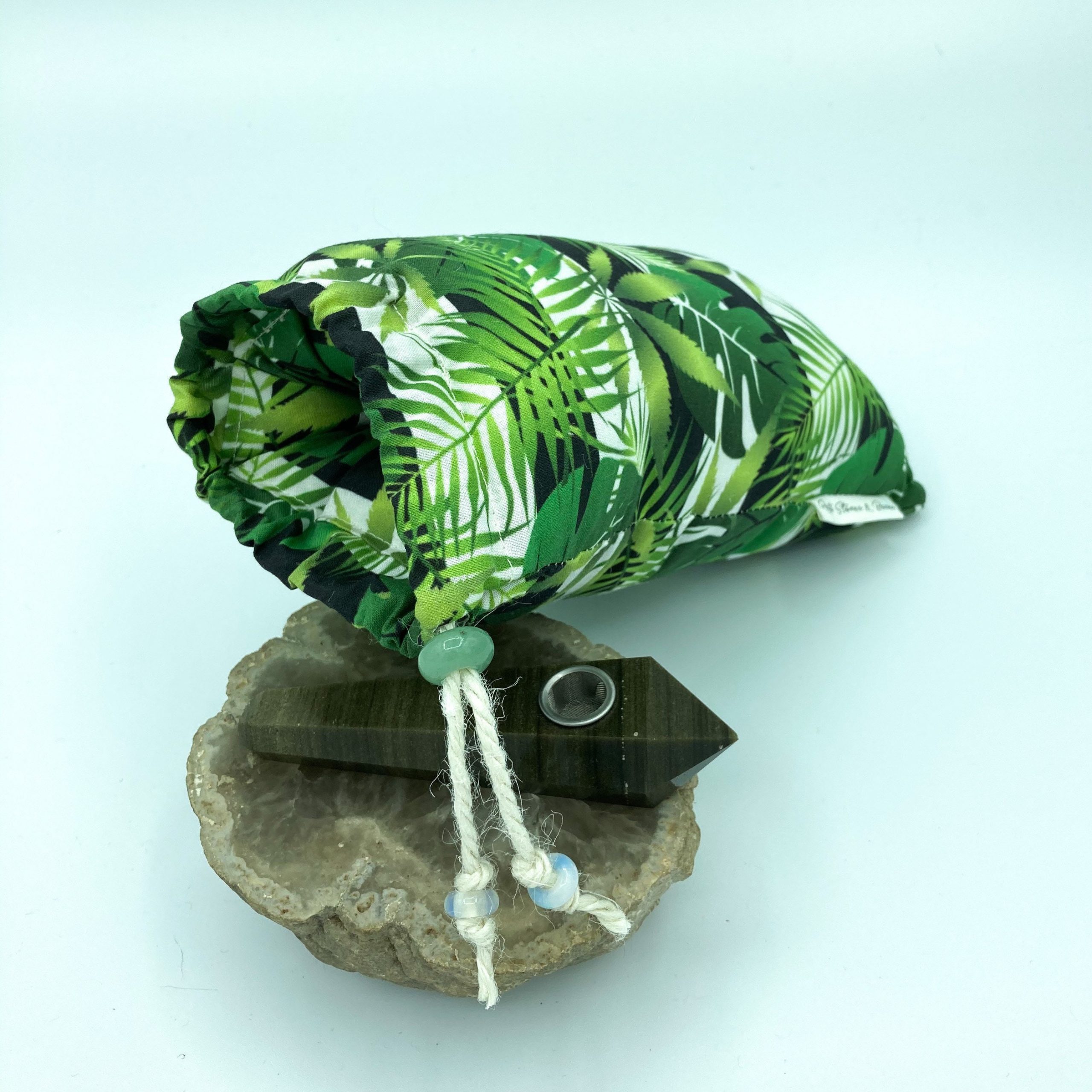 Our Cannabis Greenery Pipe Case features either an Aventurine and Opalite gemstone bead closure, or a Tigers eye and Malachite closure.